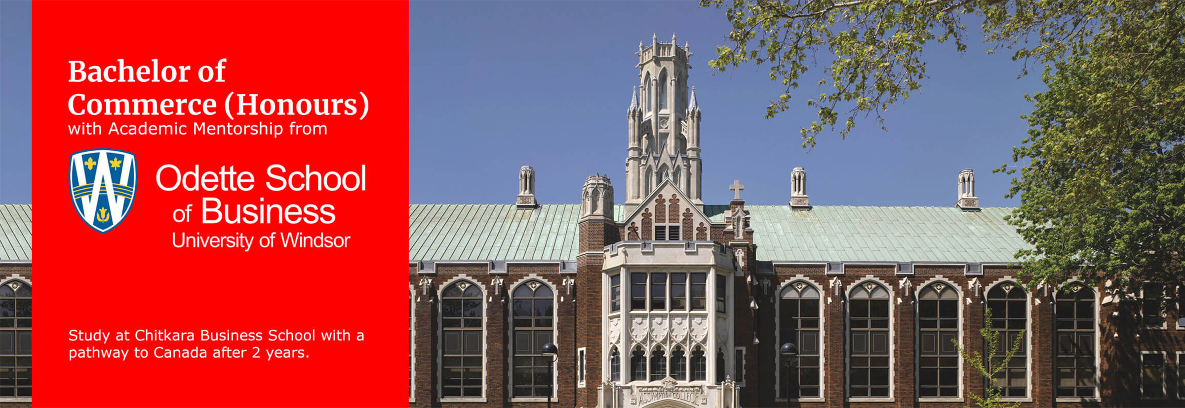 Promotional banner of the Bachelor of Commerce (Honours) program with academic mentorship from Odette School of Business, University of Windsor. Includes image of the University of Windsor’s historic building and highlights the 2+2 pathway offered by Chitkara Business School.