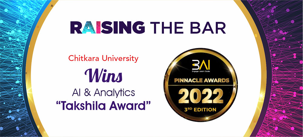Chitkara University has received the ‘Takshila Award’ for exceptional performance in imparting innovative and topical programs related to AI, Analytics and Data Sciences during the 3AI Pinnacle Awards 2022. There were 228 nominations from Academic institutions and EdTech firms across the country. Dr. Devesh Bathla, Associate Professor, Chitkara Business School, was accorded the ‘President Award’ for his academic contribution and student mentoring in the field of Analytics. Furthermore, recently graduated alumni of MBA (Business Analytics) Aridaman Singh Sethi received the ‘AI & Analytics Rising Star Award’ while two of our students Rishabh Kumar and Rakshit Jadon bagged the ‘Student Of The Year Award’ for their exceptional work in the field of AI & Analytics.
