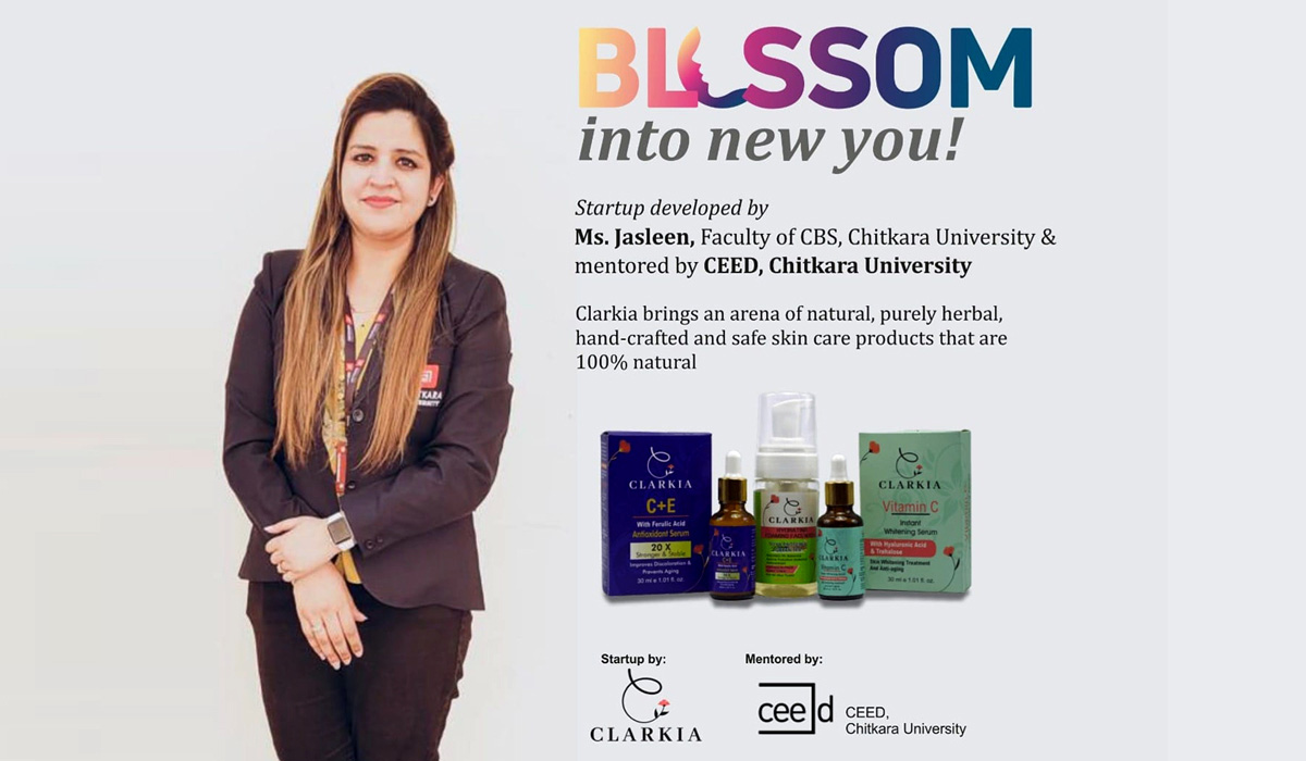‘CLARKIA’ is a promising women-led startup mentored and incubated by the Centre for Entrepreneurship Education and Development (CEED) at Chitkara University and is the dream project of Ms. Jasleen, a faculty member at Chitkara Business School, Chitkara University. With a mission of satisfying the diverse beauty needs of the customers, Ms. Jasleen started Clarkia to promote natural, purely herbal, hand-crafted and safe to use skincare products. The startup is trusted for manufacturing products that are 100% natural and free of ingredients like Paraben, Petrochemicals, Phthalates, and GMO. These products are formulated by experts in the most hygienic atmosphere using best quality ingredients and advanced technology. Clarkia products are admired for their aspects like purity, accurate composition, long shelf life, precise pH value and no side effects. The products are laboratory tested, eco-friendly and cruelty-free. Clarkia’s products are available on Amazon, Flipkart and Clarkia’s official website.