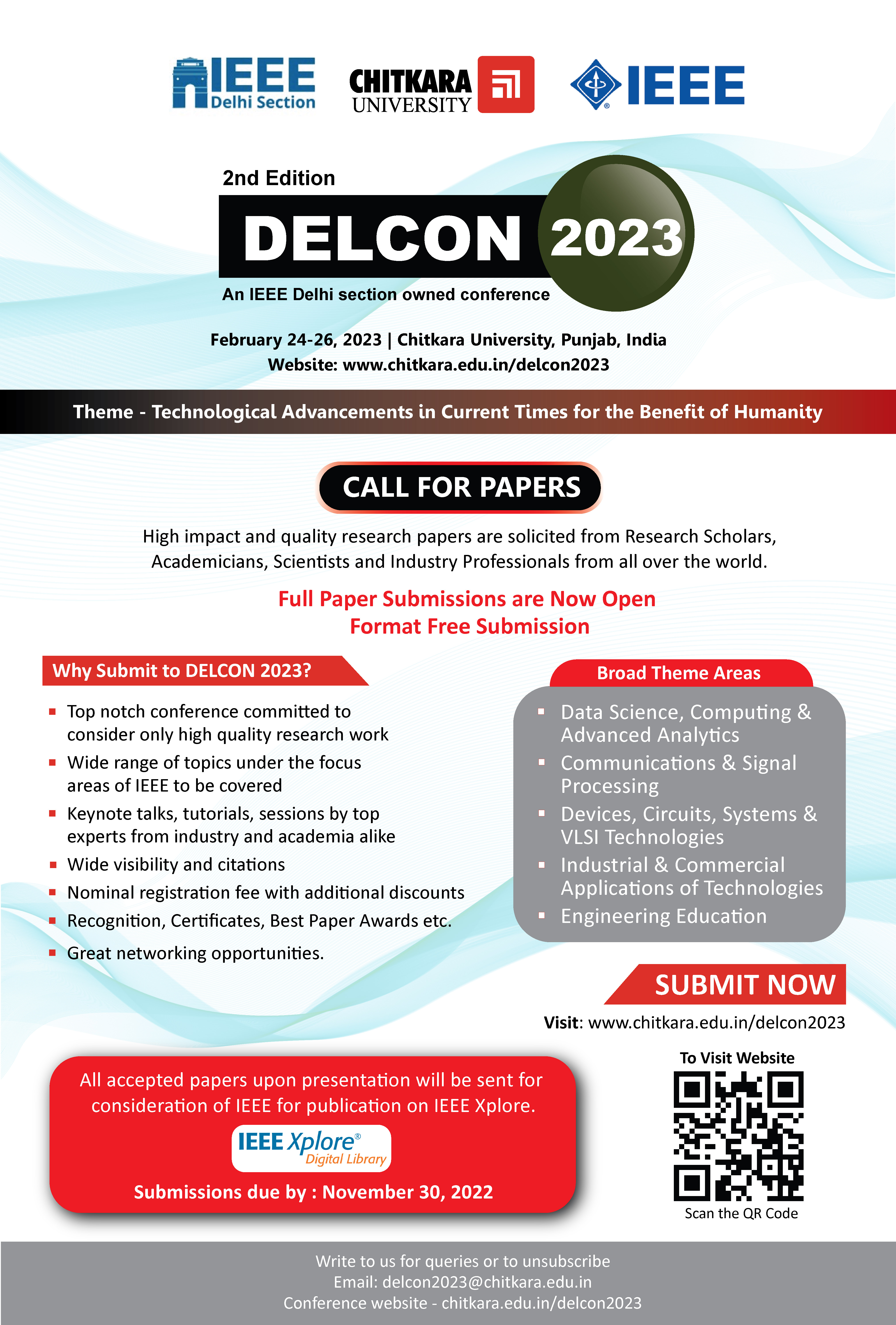 DELCON 2023 is going to be the 2nd edition of IEEE Delhi section owned conference that will be organized and hosted by Chitkara University, Punjab, India during 24-26 February, 2023.