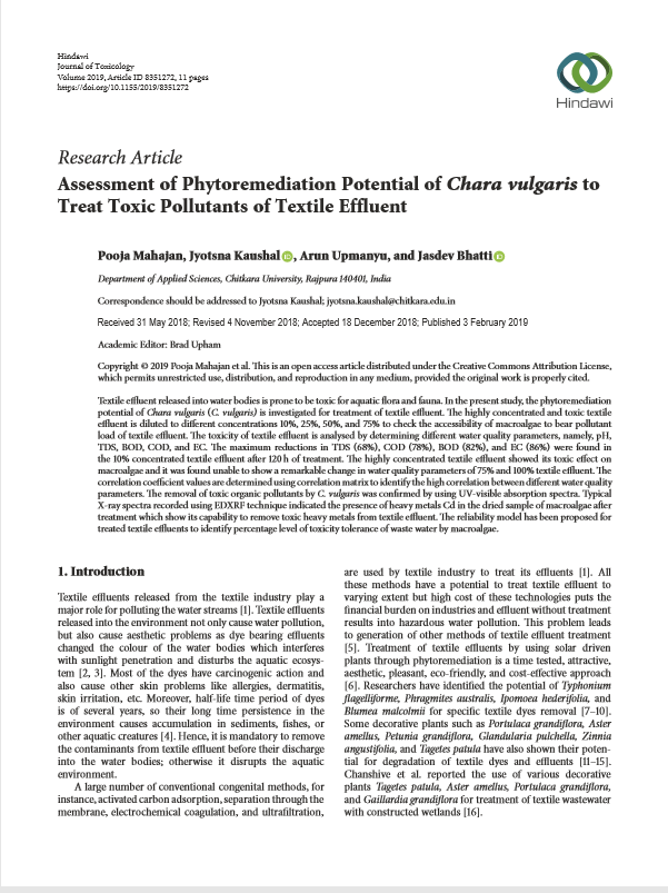 | Title of the Research Paper : Assessment of Phytoremediation Potential of Chara vulgaris to Treat Toxic Pollutants of Textile Effluent |