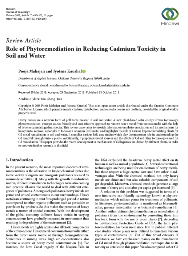 | Title of the Research Paper : Role of Phytoremediation in Reducing Cadmium Toxicity in Soil and Water |