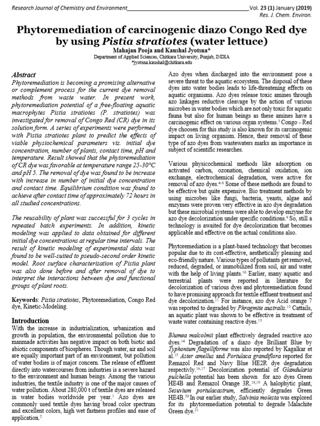 | Title of the Research Paper : Phytoremediation of carcinogenic diazo Congo Red dye by using Pistia stratiotes (water lettuce) |