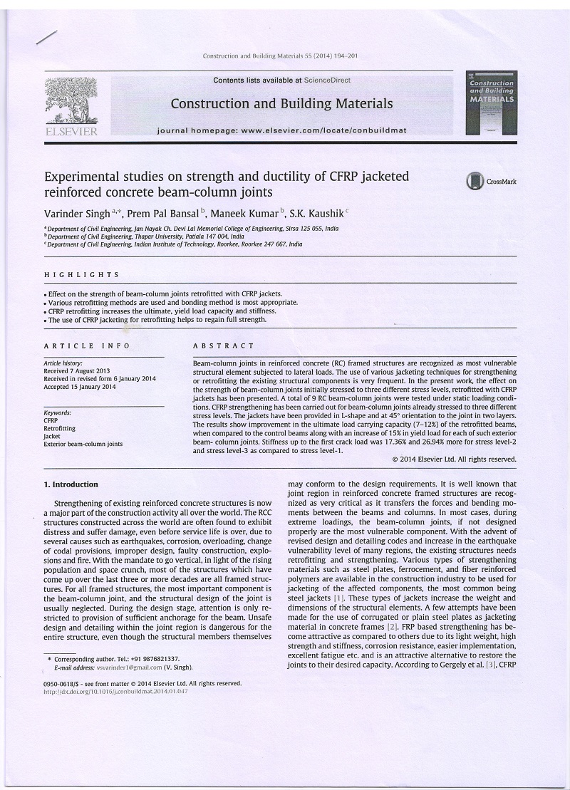 | Title of the Research Paper : Experimental studies on strength and ductility of CFRP jacketed reinforced concrete beam column joints |
