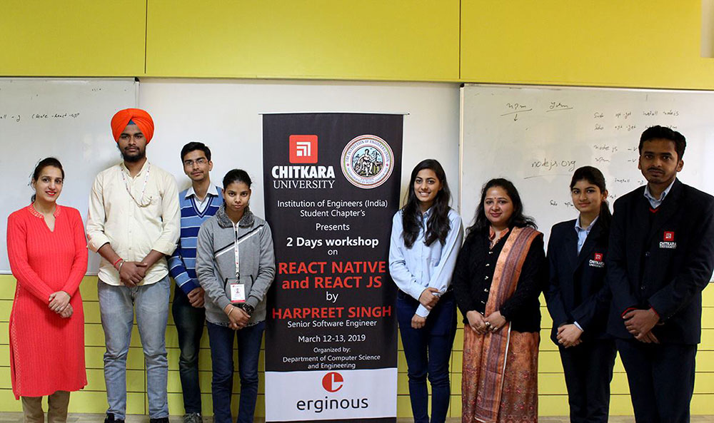IE(I) Student Chapter, Chitkara University, organised a two-day Workshop on ‘React Native and React JavaScript’ at Chitkara University, Punjab, on March 12-13, 2019. The event was conducted in collaboration with Erginous, a Global Web Design and Mobile applications Development Company.