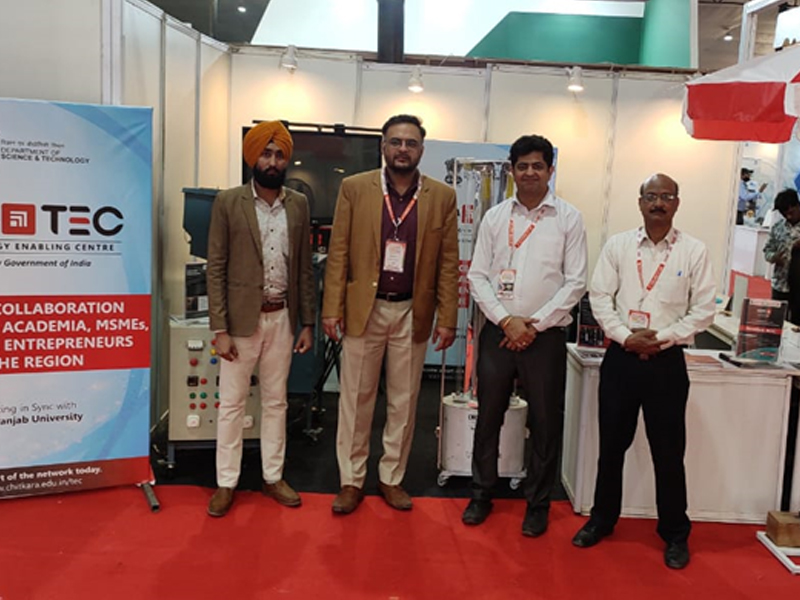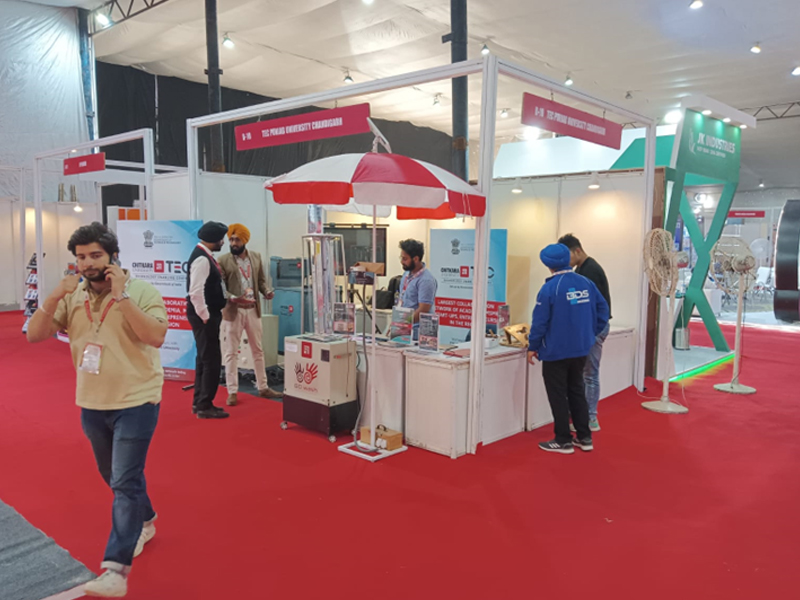 Chitkara University Technology Enabling Centre was invited to participate in the 11th edition of the annual exhibition ceremony MACHAUTO EXPO 2022 on March 11, 2022, at Ludhiana Exhibition Centre, Ludhiana, Punjab. It was organized to provide a platform for the MSMEs units across the country to judge the new technologies & innovations at the various technology research centres of educational institutes and industries. A dedicated space was provided to display the projects completed under the fabrication centre of Chitkara University. The event was based on Engineering Machinery, Machine Tools, Auto Parts, Hand Tools, CNC Machines and SPMs, Automation Technology, etc. Based on this, the four major products- 80 wash, Grain Paddy Drying Machine, Solar Powered Multipurpose Canopy, and UC-V Robot were selected and exhibited in the event. Dr. Sachin Ahuja (Professor and Director, Research); Dr Varun Chhabra (Associate Professor, CURIN), Dr K.Z. Molla (Associate Professor, Mechanical Engineering); Mr. Sagar Juneja (Assistant Dean, CURIN and Coordinator CU-TEC); Mr Chanpreet Singh (Project Manager, CURIN) participated in the event. The objective of attending the exhibition was to understand the requirement of the industry and to collaborate with MSMEs of the region.