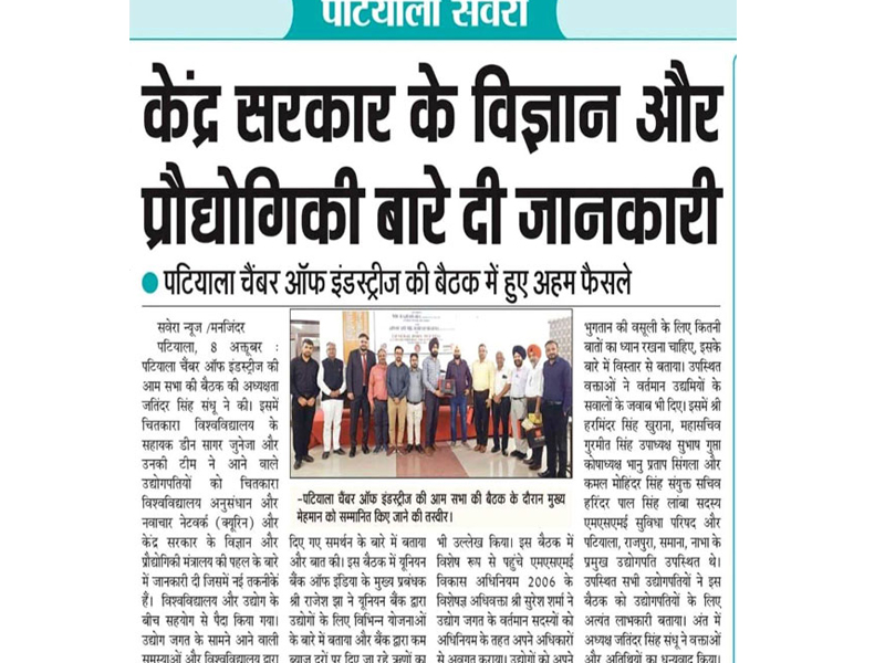 Under DST Sponsored TEC Project, Chitkara University-Technology Enabling Centre & Patiala Chamber of Industries jointly organized a late evening event at Patiala Chamber of Industries Hall, C-109, Industrial Area, Focal Point, Patiala on 7th Oct 2022.