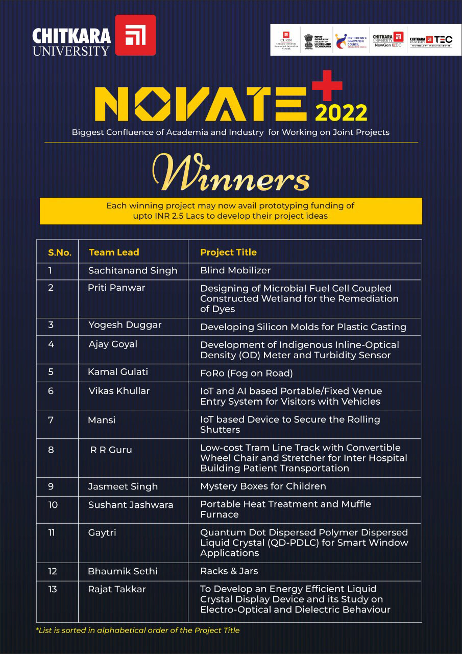 Mr Sagar Juneja – Asst. Dean, Mr Chanpreet Singh- Project Manager, and Mr Lovit Kumar, Office Executive CURIN were the core team to organize the event. The winners of the Novate+ 2022 will be announced soon.